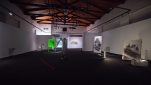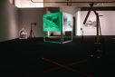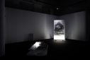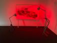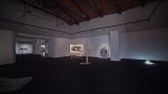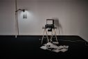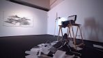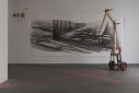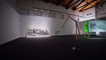 The vast empty expanses in Pappas’ landscapes seem alien to the Mediterranean experience. They are neither familiar nor inviting, no welcoming homes here. All the drawings by Pappas are black and white, as if colour (vegetation) were an unknown entity, or as if the artist suffered from chromophobia. In this respect, interestingly, the absence of colour is counterbalanced by light fixtures – neon tubes and tripod desk lamps – which illuminate the drawings, transforming the venue into a darkroom and the display into a dreamlike installation. The artist, in fact, accompanies his drawings with several micro-installations: a wood assemblage reminiscent of constructivist architecture, bathed in greenish light; three Plexiglas sheets interacting with a blue light fixture, casting reflections (the artist notes, ‘The flow of electricity is the only living thing here; everything else is on stand-by, dead’); a printer-scanner that ‘prints nothing’ and a blinking lamp, both of which produce eerie sounds; a small-scale drawing illuminated by a hanging hand lamp; finally, the photograph of a seaside landscape printed on rice paper and mounted on a small wood board placed on the floor combined with a circular neon lamp, a kind of halo that elevates this landscape into sacred ground, a land of salvation – or escape. Everything here evokes an atmospheric ambiance that takes the viewer on an immersive experience.
